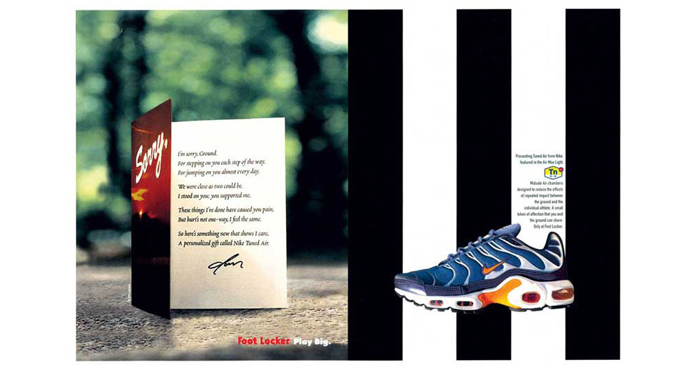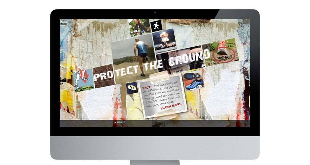 Did you know that each day just about every human on this planet, without fail, abuses the ground? This was the premise for the launch of Nike Tuned Air. Answering the question of who will speak for the ground?, NIKE was cast as the savior by developing a soft cushion of air and support between you and our precious ground. Realized through TV, print, and online, the results were a very successful launch for everyone involved.