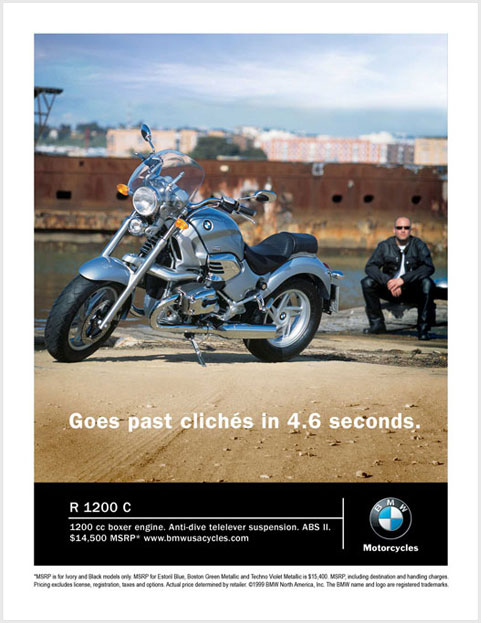 For BMW, the launch of the R-1200C motorcycle was an opening into the hardcore cruiser market. To introduce the brand outside of its core enthusiast circle, the strategy was to give the new model credibility in a space where BMW had no heritage. The creative directly challenged the essence of the cruiser market mind-set in a way that served BMW as a relevant option. The results were a successful product launch and a more competitive reputation.